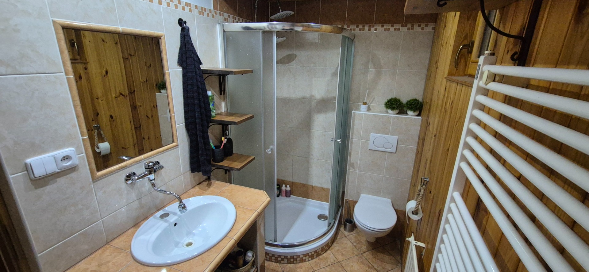 Koupelna a toaleta – sprchový kout, umyvadlo a toaleta, hostům jsou k dispozici také ručníky, fén na vlasy a základní hygienické vybavení.